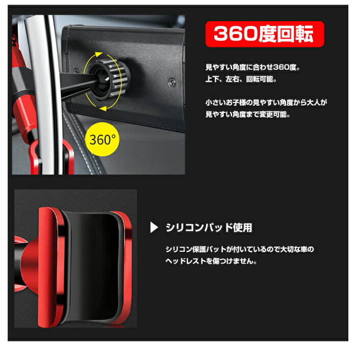 【サイズ】 ・タブレット装着部の高さ:約6.8cm ・タブレット装着部の幅:約12cm ・ヘッドレスト装着部の幅:約14.5〜18.5cm ※汎用タイプ 【カラー】 ・レッド ・ブラック ・ブルー 【商品説明】 工具不要で取り付け簡単! ヘッドレストにめ込むだけで使用可能です。