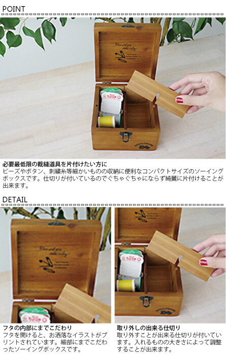 商品詳細商品説明●アンティーク風のイラストがプリントされたお洒落なデザインの木製のソーイングボックスです。