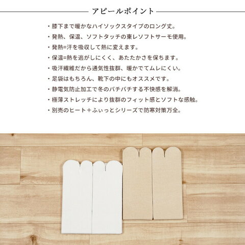 【アピールポイント】・膝下まで暖かなハイソックスタイプのロング丈・発熱、保温、ソフトタッチの東レソフトサーモ使用・発熱=汗を吸収して熱に変えます。