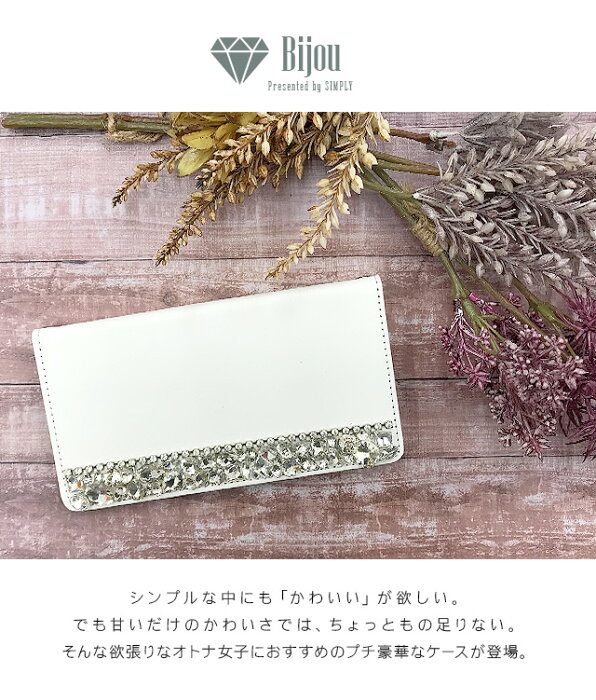 手帳型ケースにSWAROVSKIを施した大人のケース】モノトーンベースの手帳型スマホケースのサイド部分に、キラキラのラインストーン+クリスタルビジューストーンをデコレーション。
