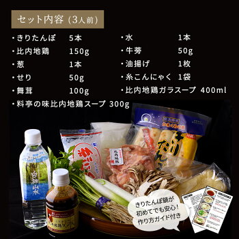 返礼品詳細 名称 きりたんぽ鍋セット 3人前 内容量 ・きりたんぽ(5本) ・比内地鶏(150g) ・葱(1本) ・せり(50g) ・料亭の味比内地鶏スープ300g ・比内地鶏ガラスープ400ml ・水(1本) ・舞茸(100g) ・牛蒡(50g) ・油揚げ(1枚) ・糸こんにゃく(1袋) 原材料 返礼品の箱側面のラベルに記載 ※アレルギー物質などの表示につきましては、お礼品に記載しています。
